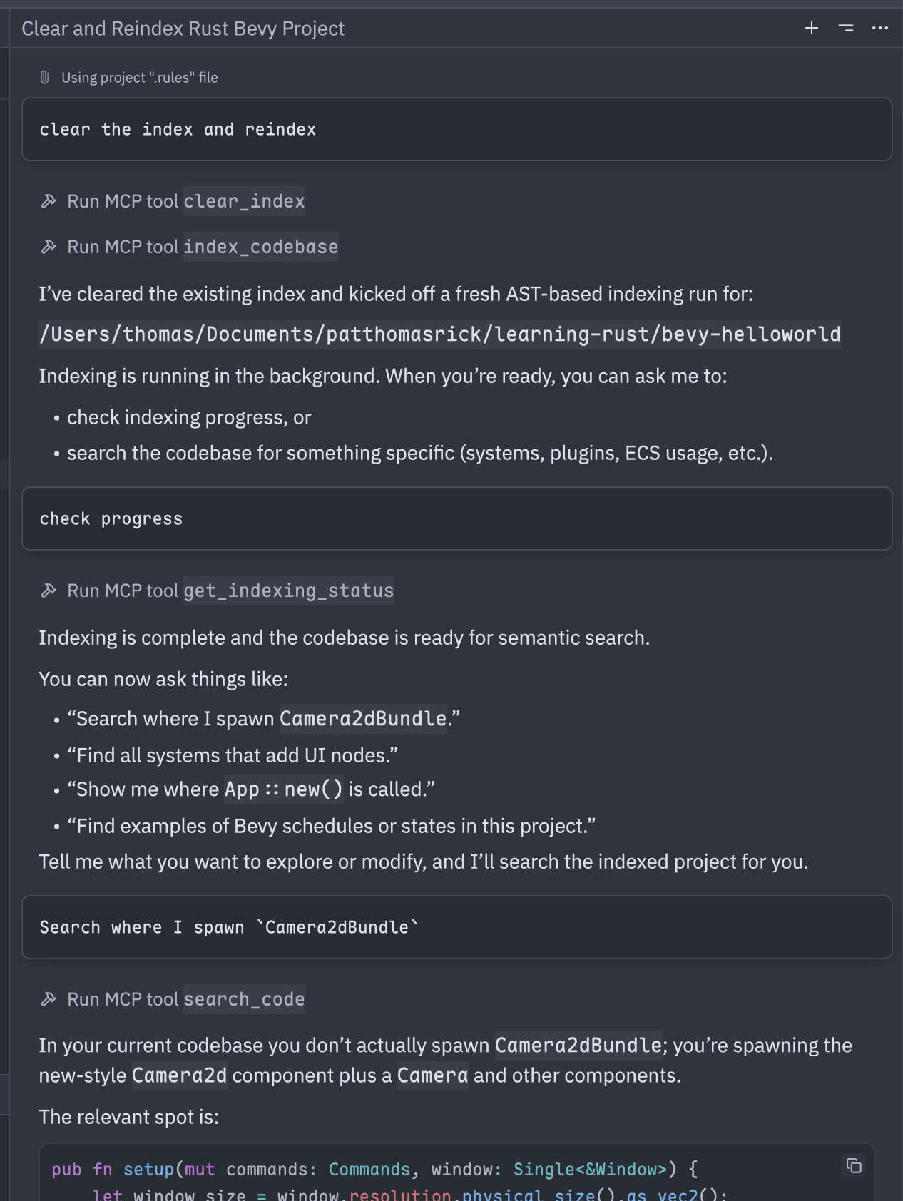 You now should be able to converse with your model and use the new tool; see below where I asked a simple question on a repo where I was learning Bevy:
